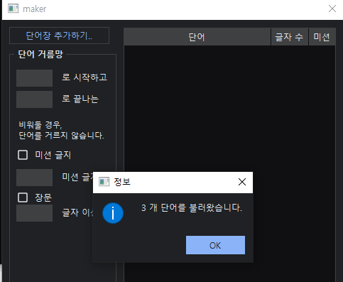 현재는 불러오기와 끝(앞)말잇기 기능 정도만 만들어 두었으며, 추후 나머지 기능도 제작 예정입니다.